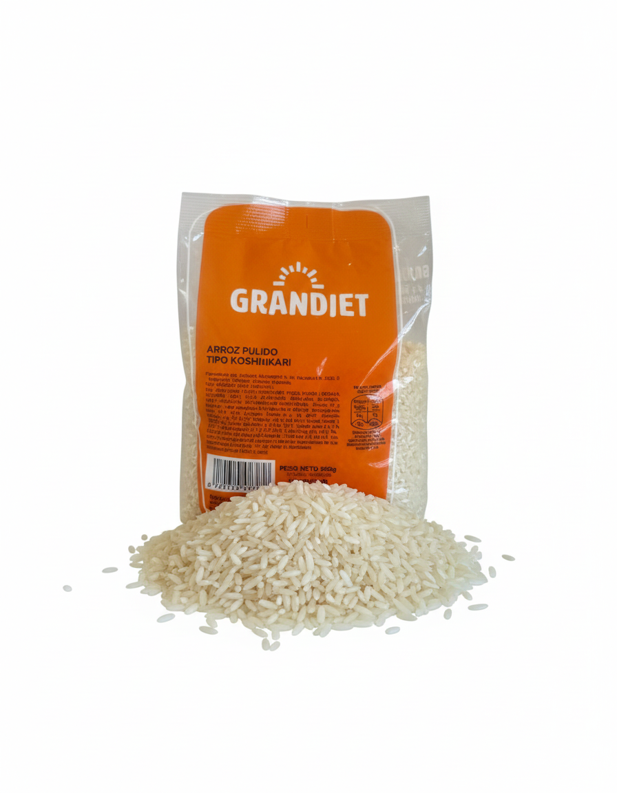 Arroz Koshihikari seleccionado, de calidad premium, cultivado para ofrecer una cocción uniforme y una textura característica. Producto naturalmente libre de gluten.