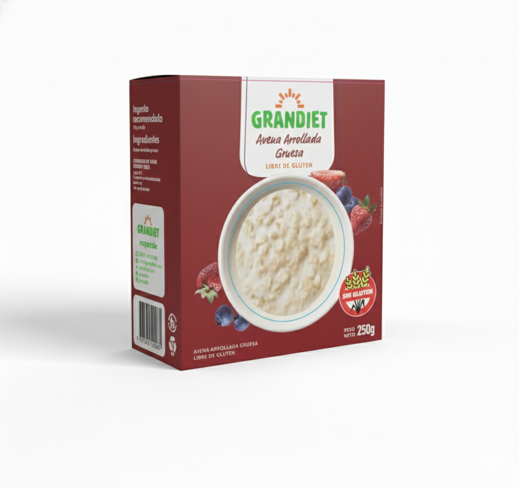 Avena arrollada gruesa libre de gluten, elaborada por Grandiet. Su textura más firme la hace ideal para recetas que requieren mayor consistencia, como granolas, panes, galletas o preparaciones cocidas. Producto nutritivo y versátil, apto para dietas sin TACC, ideal para una alimentación equilibrada y natural.