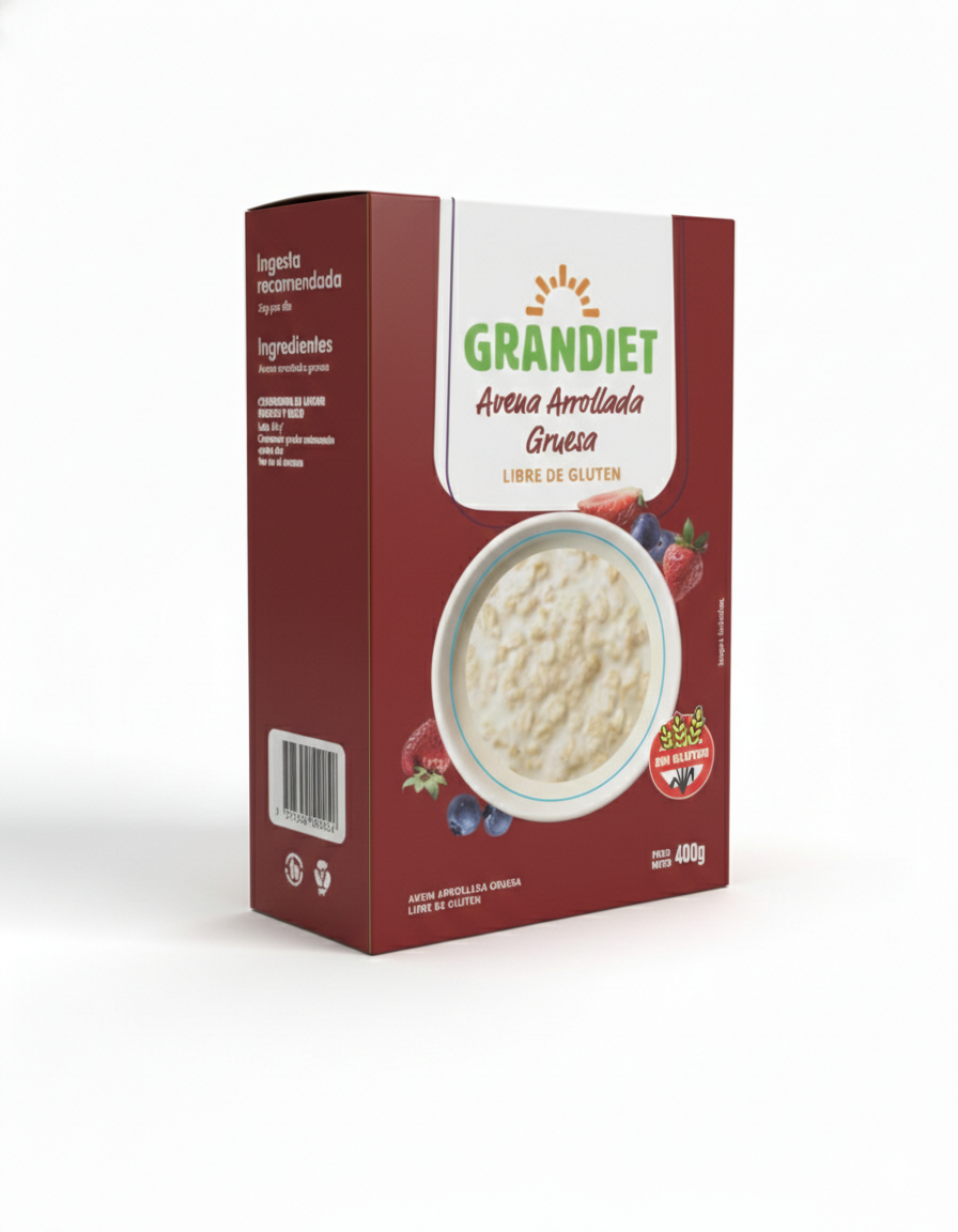 Avena arrollada gruesa libre de gluten, elaborada por Grandiet. Su textura más firme la hace ideal para recetas que requieren mayor consistencia, como granolas, panes, galletas o preparaciones cocidas. Producto nutritivo y versátil, apto para dietas sin TACC, ideal para una alimentación equilibrada y natural.