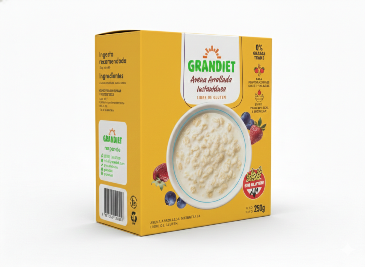 Avena arrollada instantánea libre de gluten, elaborada por Grandiet. Producto de fácil preparación, ideal para incorporar en desayunos, meriendas y recetas dulces o saladas. Su contenido de fibra y carbohidratos complejos la convierte en una excelente opción para quienes buscan una alimentación equilibrada y nutritiva, apta para dietas sin TACC.