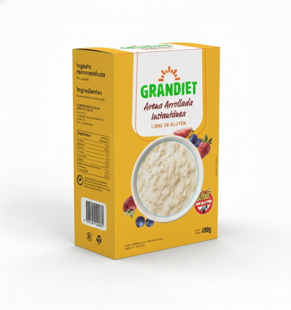 Avena arrollada instantánea libre de gluten, elaborada por Grandiet. Producto de fácil preparación, ideal para incorporar en desayunos, meriendas y recetas dulces o saladas. Su contenido de fibra y carbohidratos complejos la convierte en una excelente opción para quienes buscan una alimentación equilibrada y nutritiva, apta para dietas sin TACC.