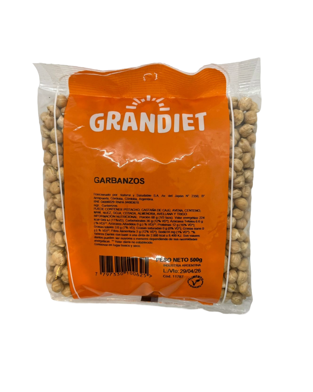Garbanzos secos seleccionados, elaborados por Grandiet. Alimento natural y nutritivo, ideal para la preparación de platos tradicionales como guisos, ensaladas, hummus y otras recetas saludables. Su aporte de proteínas, fibra y carbohidratos complejos los convierte en un excelente complemento para una alimentación equilibrada.