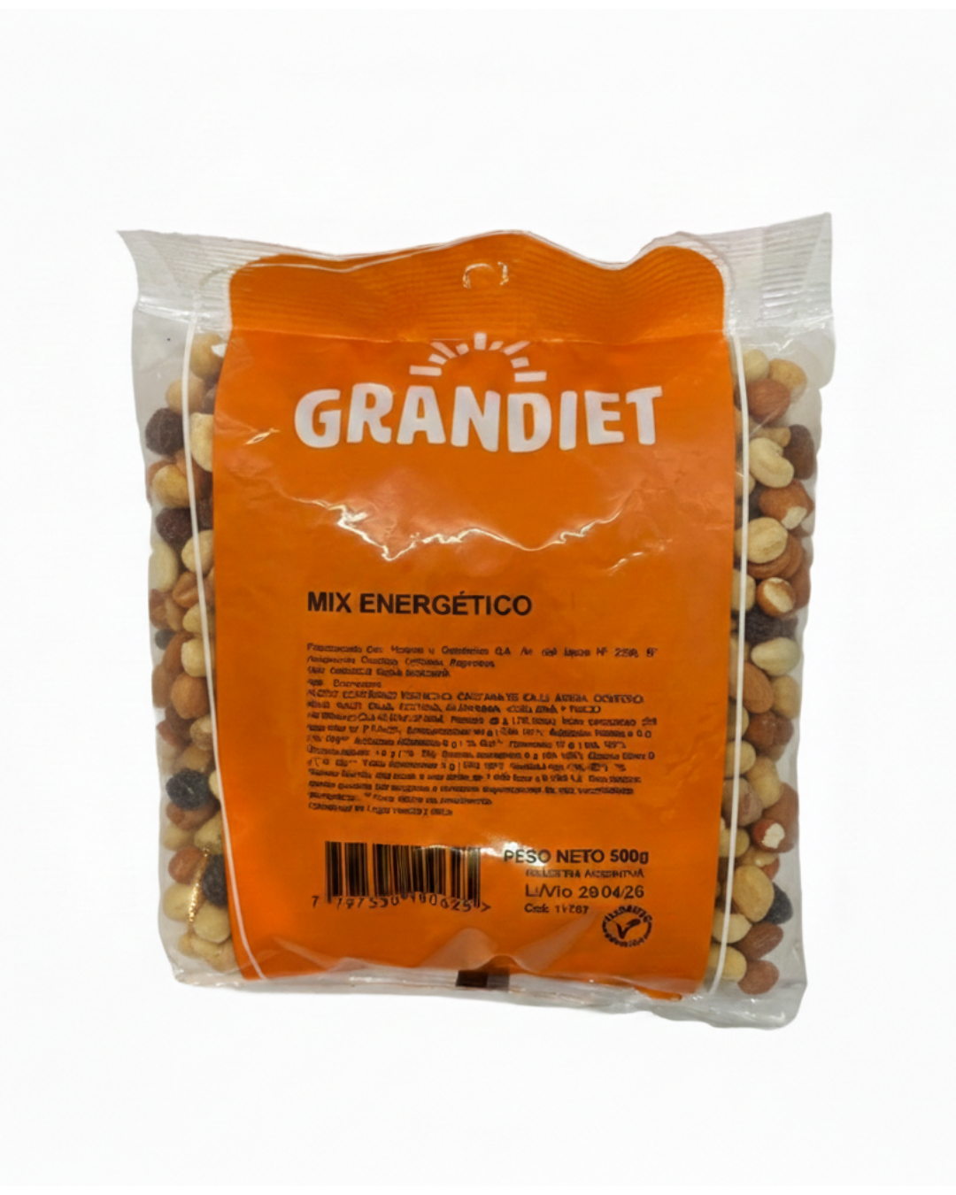 Mix Energético, elaborado por Grandiet, compuesto por una combinación de frutos secos y semillas seleccionadas. Ideal para personas activas que buscan un aporte energético natural, ya sea como snack saludable o para incorporar en desayunos, meriendas o preparaciones. Producto nutritivo y versátil para una alimentación equilibrada.